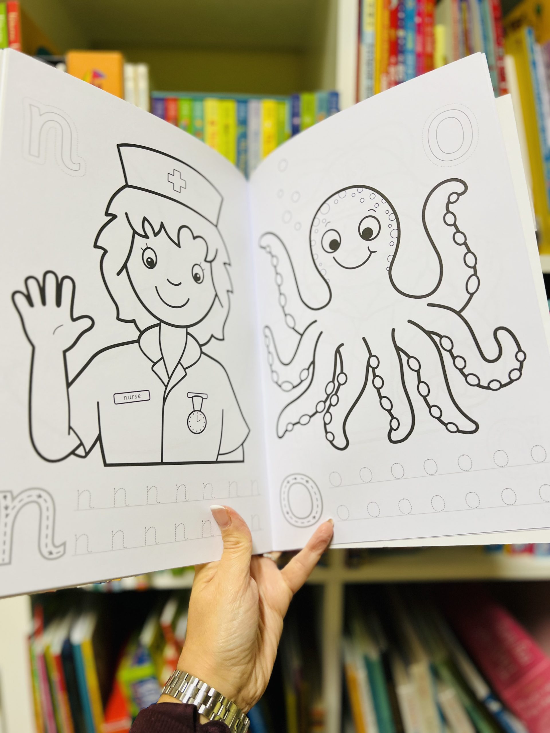 Un libro da colorare di 24 pagine per incoraggiare i bambini a leggere e scrivere.